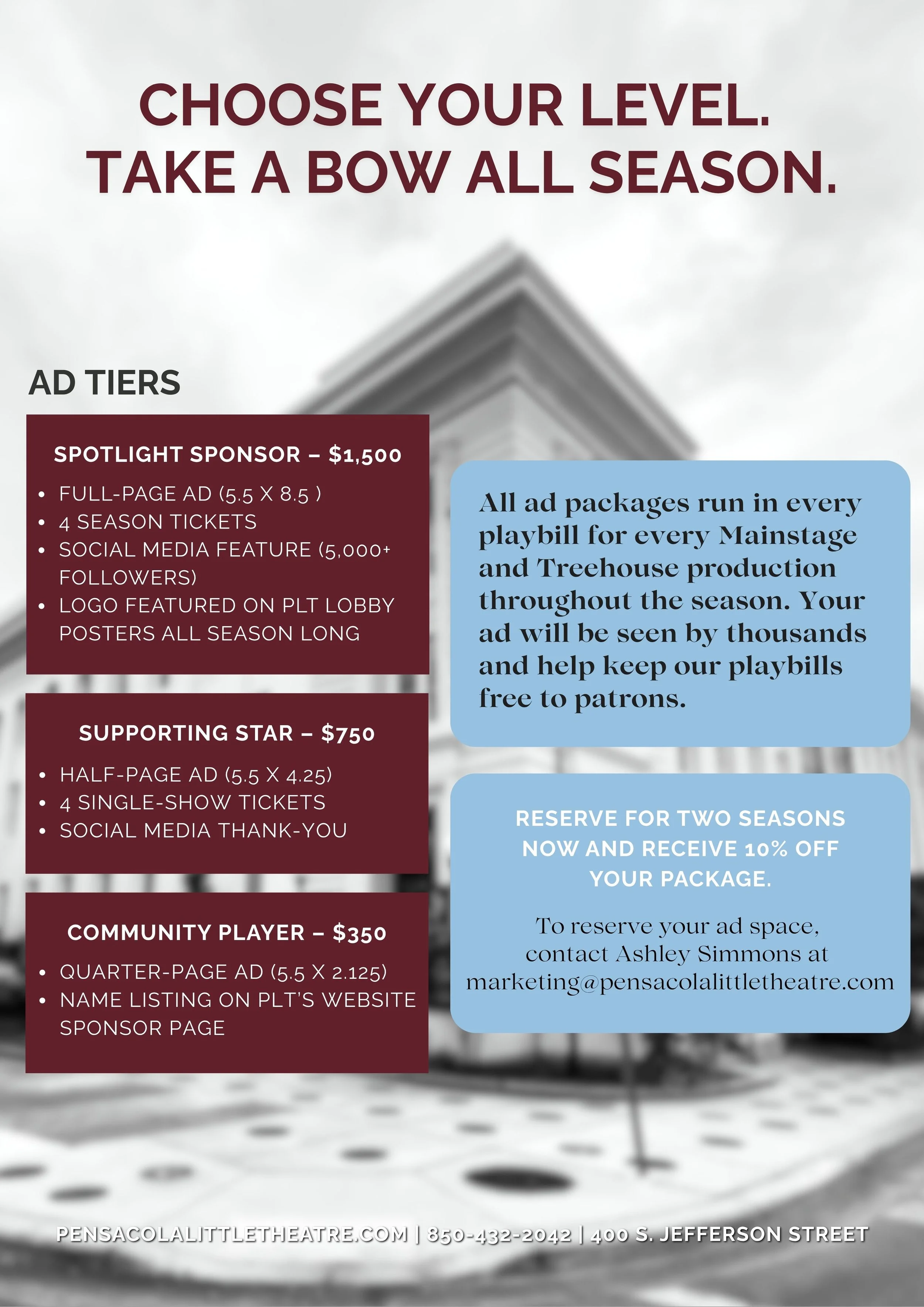 Advertising with Pensacola little theatre is a perfect opportunity for you to showcase your business, organization, or appreciation for the arts to the thousands of patrons who visit the cultural center each year.