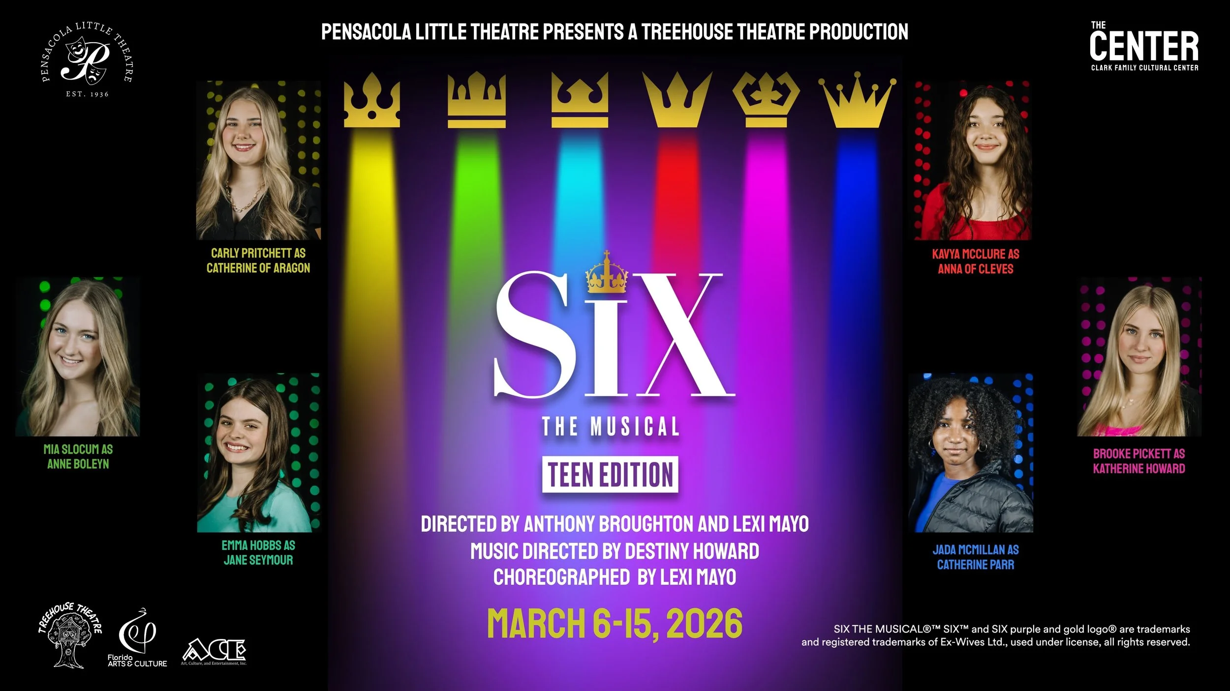 Get ready to remix history with SIX: Teen Edition, the electrifying pop musical that reclaims the spotlight for the six wives of Henry VIII. In this high-energy, concert-style show, each queen takes the mic to tell her story—her way—through catchy songs, fierce choreography, and a girl-power attitude. Equal parts history lesson and pop concert, SIX: Teen Edition, is a celebration of resilience, sisterhood, and finding your voice.